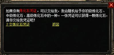 如果有炼化石凭证,可以在盟重道具回收兑换商处兑换成炼化石,NPC会随机给予初级炼化石、中级炼化石、高级炼化石中的一种。